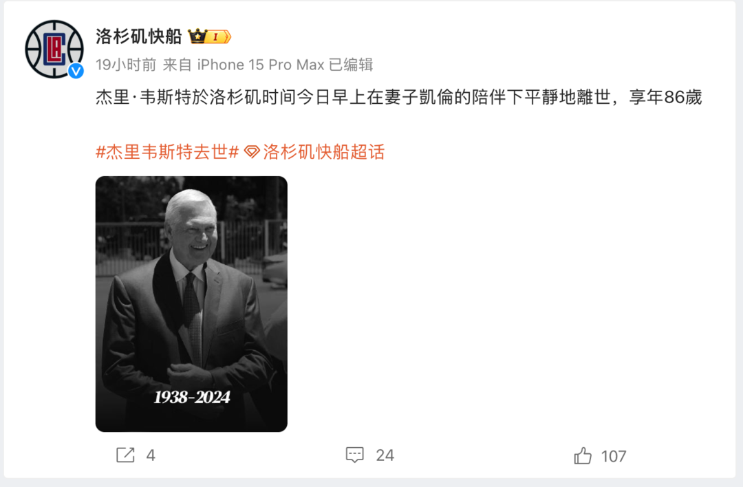 杰里·韦斯特离世后,2024年6月13日,NBA洛杉矶快船队社交账号发布了微软公司前CEO、洛杉矶快船队现老板史蒂夫·鲍尔默所写的悼词。