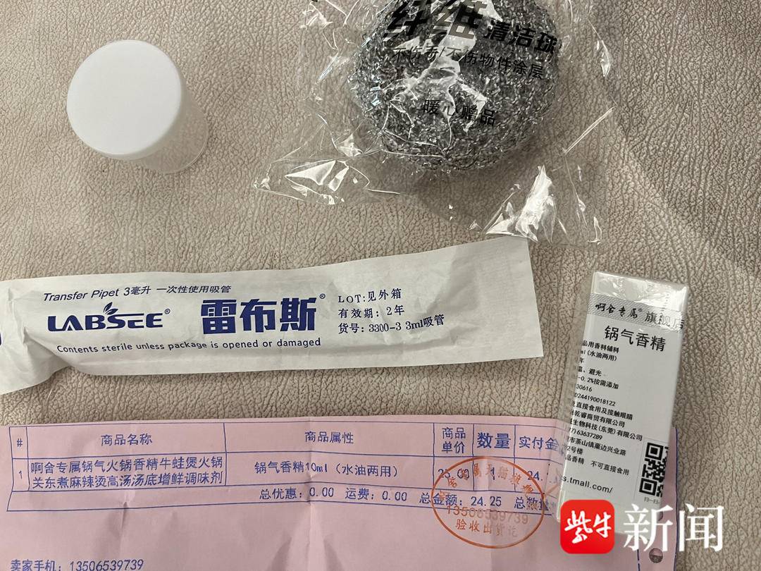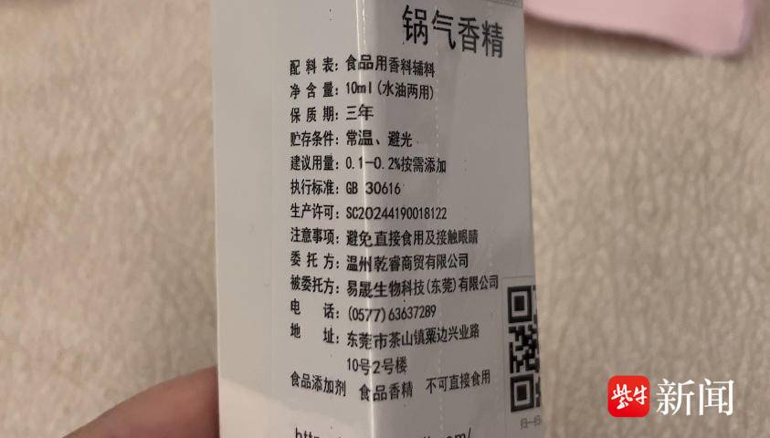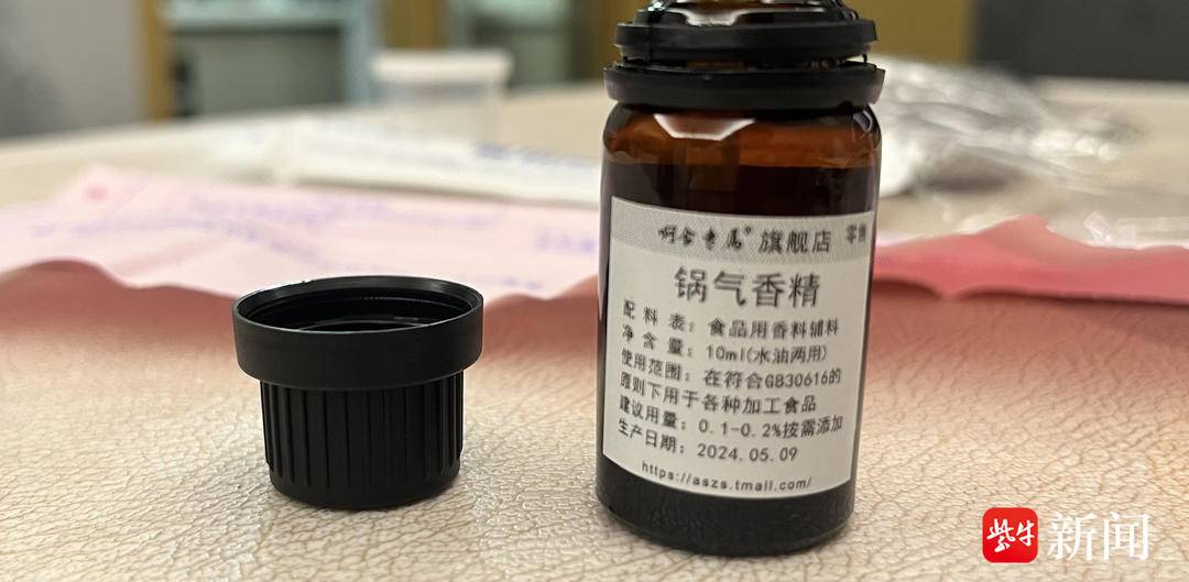 记者从网上下单了一瓶10ml的锅气香精。拿到手后,除了一小瓶液体香精外,还有一个清洁球、一个3ml的一次性使用吸管、一个20ml的小量杯。包装上有生产许可号,注意事项为避免直接食用或接触眼睛。