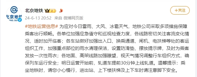 为应对今日雷雨、大风、冰雹天气,北京地铁将适时加开临客等措施