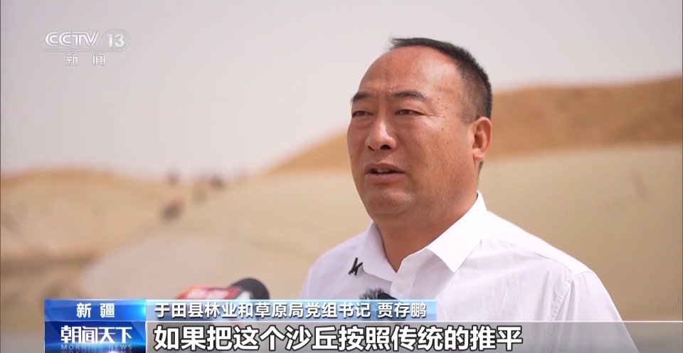 于田县林业和草原局党组书记 贾存鹏:像我身后这个沙丘,22米高,如果按照传统的推平再种植,每亩需要1万元,至少需要40天,按照梯田式的方式去治沙,现在只需要5到6天就可以完成,每亩成本降低到1800元。