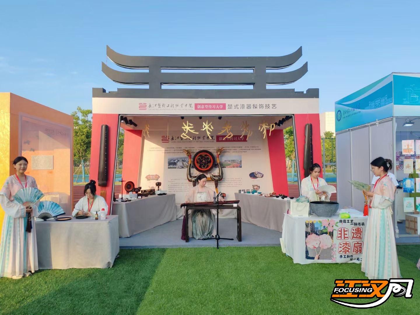 全国大学生艺术展演活动每三年举办一届,本届展演分为高校开展活动、省级集中展演、全国现场展演三个阶段,各地各校编创了大批艺术精品。长江艺术工程职业学院的“楚式漆艺髹饰技艺”项目作为湖北省34所高校展演项目亮相现场。该项目围绕“互鉴知非遗”主题,通过漆艺体验、展示、展演三大形式,扩大楚式漆器技艺的影响力。漆艺体验以当下最热门的大漆漂扇为主,在制作与安装互动中,让大家了解大漆特色。漆艺展示则将该校的开发的“琴茶食书”四大主题传统漆工艺文创产品进行现场展示。漆艺展演是以楚式漆艺描绘技法展演、古琴演奏为手段,让大家直观了解楚式漆器制作流程和楚式漆器产品的独特魅力。
