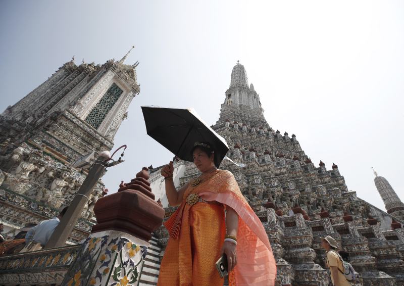 5月6日,泰国曼谷饱受高温炙烤,游客撑伞遮阳。图/IC photo