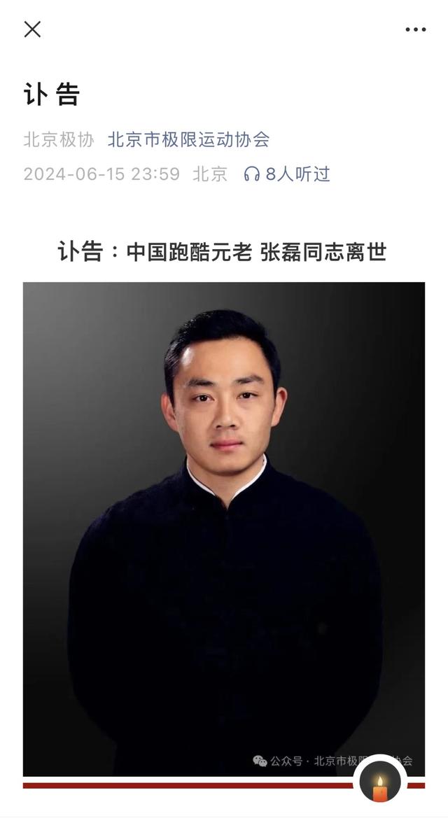 北京市极限运动协会6月15日深夜发布讣告,北京市极限运动协会副会长、北京市极限运动协会跑酷委员会会长、极限梦跑酷创始人、中国跑酷运动的重要推动者张磊同志,于2024年6月12日上午11时,因心脏疾病医治无效,在北京去世,终年39岁。
