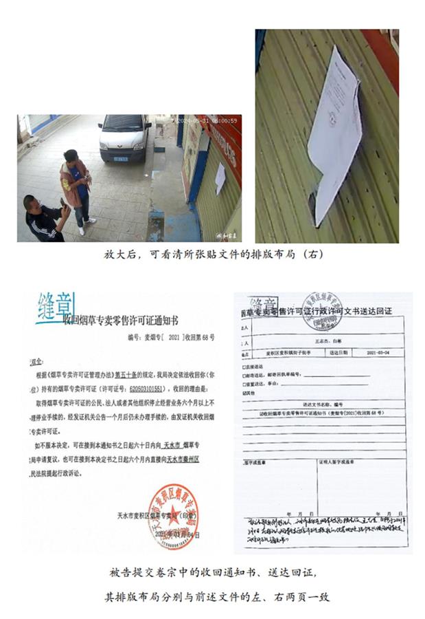 庭审现场,阮双全代理律师提供了多份经过公证的视频、视频截图等证据,认为麦积区烟草局涉嫌伪造三年前本应送达的《收回烟草专卖零售许可证通知书》的送达过程。