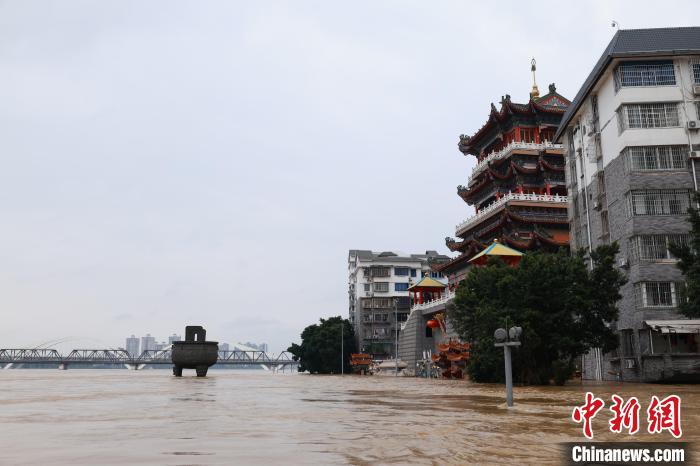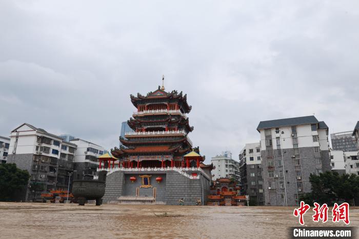 6月19日9时40分,广西柳江柳州水文站出现86.3米洪峰水位,超警戒水位3.8米。洪峰来袭,柳州沿江低洼地段被浸泡在洪水中,沿河居民区被淹至二楼。柳州相关部门出动快艇,穿梭在浑浊的洪水中,转移有需要的受困民众。图为位于柳州江边的西来寺被淹。 中新社记者林馨摄