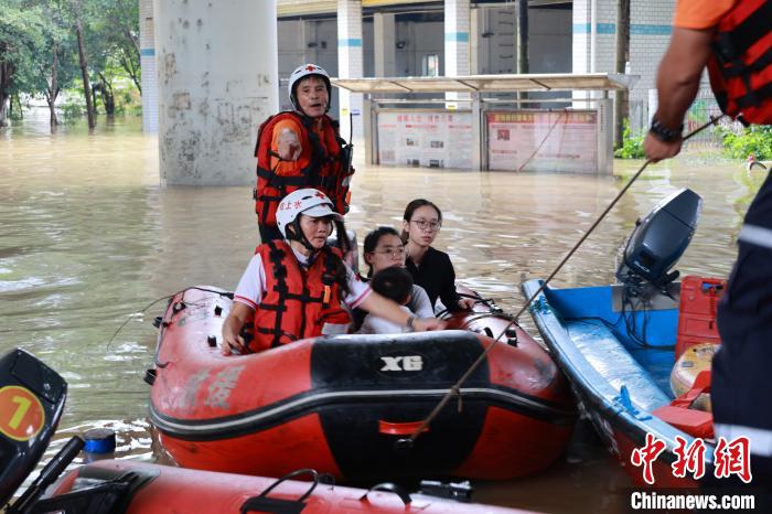 6月19日9时40分,广西柳江柳州水文站出现86.3米洪峰水位,超警戒水位3.8米。洪峰来袭,柳州沿江低洼地段被浸泡在洪水中,沿河居民区被淹至二楼。柳州相关部门出动快艇,穿梭在浑浊的洪水中,转移有需要的受困民众。图为柳州水上救援队转移民众。 中新社记者林馨摄