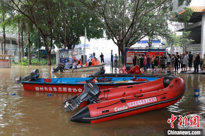 6月19日9时40分,广西柳江柳州水文站出现86.3米洪峰水位,超警戒水位3.8米。洪峰来袭,柳州沿江低洼地段被浸泡在洪水中,沿河居民区被淹至二楼。柳州相关部门出动快艇,穿梭在浑浊的洪水中,转移有需要的受困民众。图为柳州水上救援队伍在洪水路段等待执行救援任务。 中新社记者林馨摄