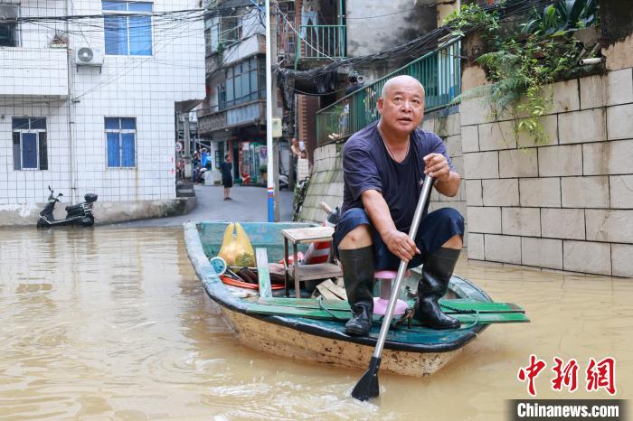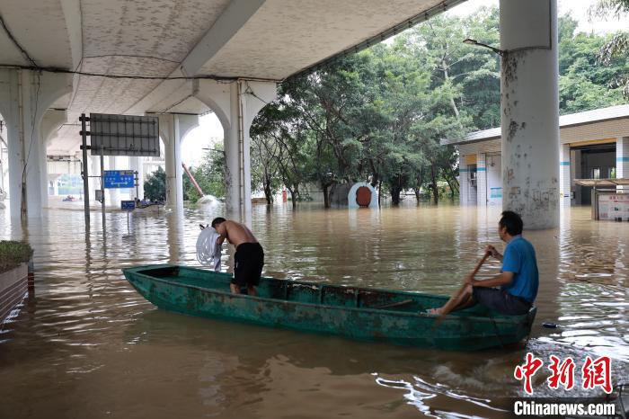 6月19日9时40分,广西柳江柳州水文站出现86.3米洪峰水位,超警戒水位3.8米。洪峰来袭,柳州沿江低洼地段被浸泡在洪水中,沿河居民区被淹至二楼。图为柳州沿河路段被淹,民众划船出行。 中新社记者林馨摄