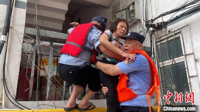 6月19日9时40分,广西柳江柳州水文站出现86.3米洪峰水位,超警戒水位3.8米。洪峰来袭,柳州沿江低洼地段被浸泡在洪水中,沿河居民区被淹至二楼。柳州相关部门出动快艇,穿梭在浑浊的洪水中,转移有需要的受困民众。图为柳州水上派出所民警转移民众。 中新社记者林馨摄
