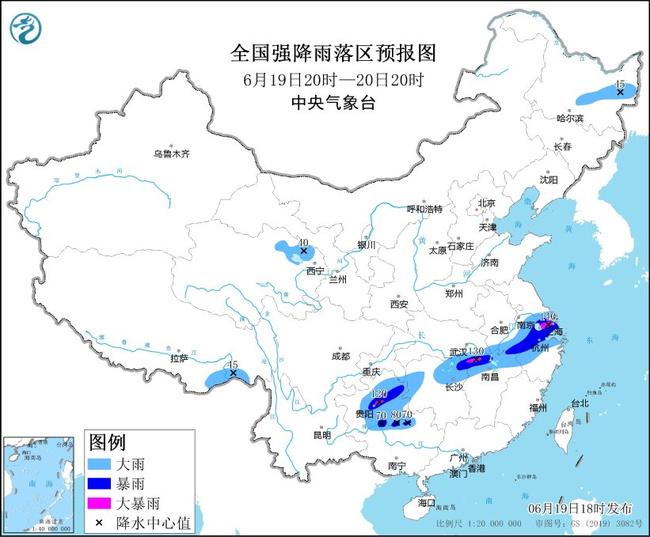 预计,6月19日20时至20日20时,苏皖南部、上海、浙江中北部、江西北部、湖北东南部、湖南中北部、贵州中东部、广西北部以及黑龙江东北部、青海东北部等地部分地区有大到暴雨,其中,江苏东南部、上海西部、湖北东南部、江西西北部、贵州中部等地局地有大暴雨(100~140毫米)。上述部分地区伴有短时强降水(最大小时降雨量20~50毫米,局地可超过60毫米),局地有雷暴大风或冰雹等强对流天气。