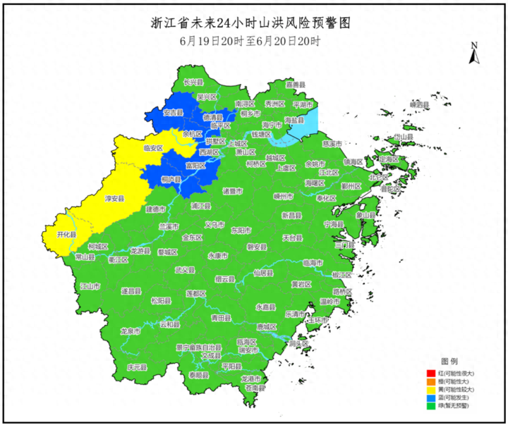 浙江省水利厅、省气象局6月19日16时01分联合发布山洪灾害预警:根据省气象台未来降雨预报,预计6月19日20时至6月20日20时,临安区、淳安县、开化县发生山洪灾害可能性较大(黄色预警),余杭区、富阳区、桐庐县、德清县、安吉县可能发生山洪灾害(蓝色预警)。
