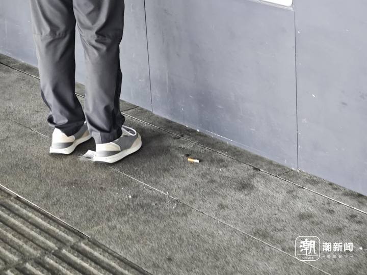 大多数乘客都会在进站口外设置的吸烟区吸烟,但也有小部分会选择站在路边抽,抽完之后将烟头随手丢在地上,踩一脚就离开了。