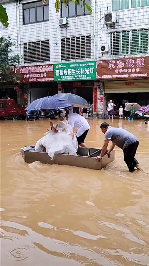 消防员答应了这一请求,新娘和伴娘坐上消防车,将两人送至溶江镇。“二十多公里,消防车大概走了20分钟,到溶江镇后,有一段路的积水超过1.5米,消防车也不能过,她们就下了车。”黄先生说,消防员有紧急任务,便开车离开了。为了迎娶新婚妻子回家,黄先生向朋友借来一艘自制的小船,妻子坐在船上,他和岳父等人一路推船,两三公里后,他们走完了积水路段。