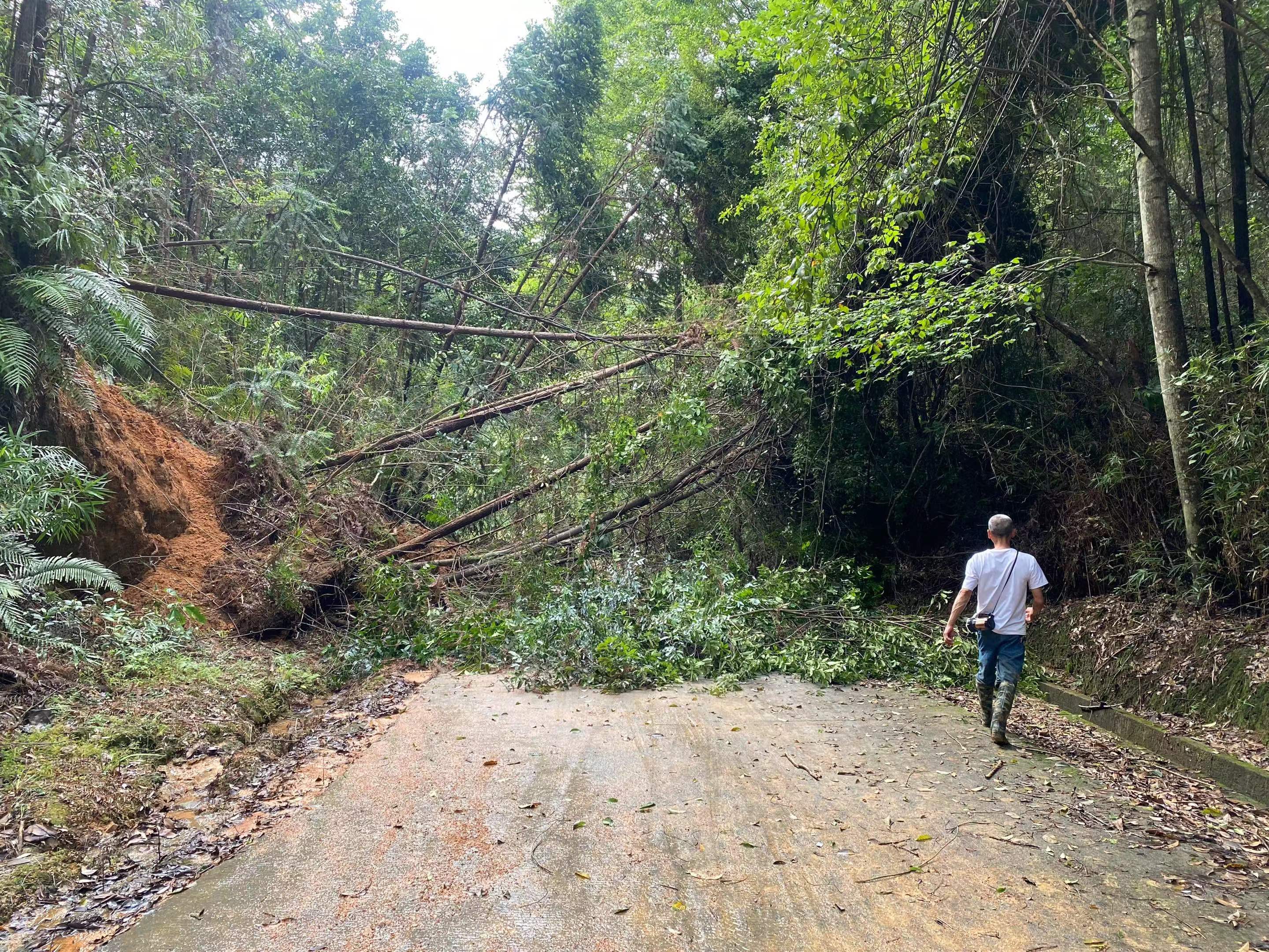 有的坡横过整段小路,好几米高,踩着也滑,他穿过时还得小心别给树干绊倒;有的路给水截断了,边上路基也掏空了,他只能翻山绕路。