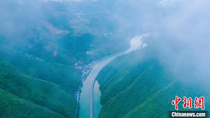 6月23日,雨后的湖北省兴山县云雾缭绕,境内的“水上公路”宛如一条玉带,与群山、河水、云雾和村庄构成一幅美丽的生态山水画。兴山县地处三峡库区,是王昭君的故乡。兴山“水上公路”是一条生态环保公路,当地将公路建在峡谷的“水上”,从而避免开山毁林。如今,“水上公路”已成为兴山知名的网红打卡地。图为兴山“水上公路”美景(无人机图片)。王雷摄
