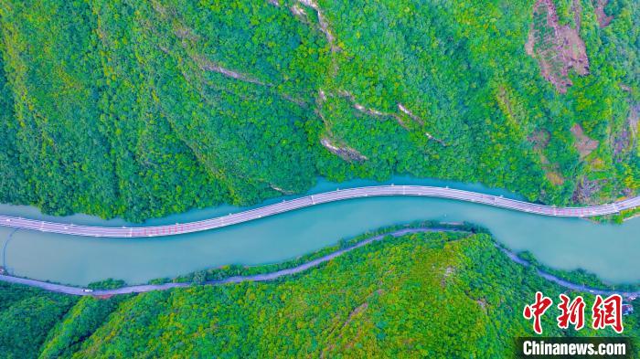 6月23日,雨后的湖北省兴山县云雾缭绕,境内的“水上公路”宛如一条玉带,与群山、河水、云雾和村庄构成一幅美丽的生态山水画。兴山县地处三峡库区,是王昭君的故乡。兴山“水上公路”是一条生态环保公路,当地将公路建在峡谷的“水上”,从而避免开山毁林。如今,“水上公路”已成为兴山知名的网红打卡地。图为建在峡谷里的“水上公路”(无人机图片)。王雷摄