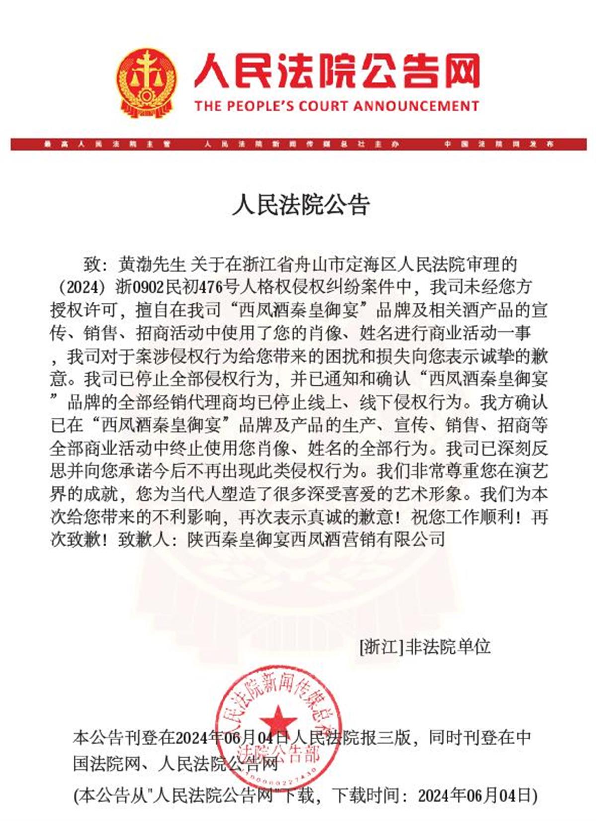 今年6月初,陕西秦皇御宴西凤酒营销有限公司向演员黄渤致歉,称该司未经授权许可,擅自在“西凤酒秦皇御宴”品牌及相关酒产品的宣传、销售、招商活动中使用了黄渤肖像、姓名进行商业活动,为此表示诚挚的歉意。