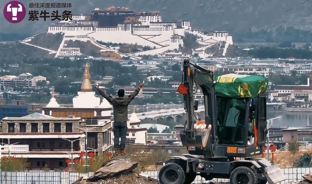 许飞开着挖掘机与布达拉宫合影