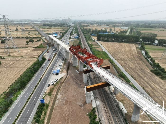 记者从中国铁路上海局集团有限公司获悉,6月25日14时20分,在蚌埠市淮上区曹老集镇蚌埠北特大桥施工现场,一台SPJ900架桥机将最后一榀近800吨的预制简支箱梁稳稳地架设在桥墩支座上,标志着淮宿蚌城际铁路蚌埠北特大桥跨京沪铁路架梁顺利完成,为该施工区段后续简支箱梁架设和无砟轨道施工奠定了坚实的基础。