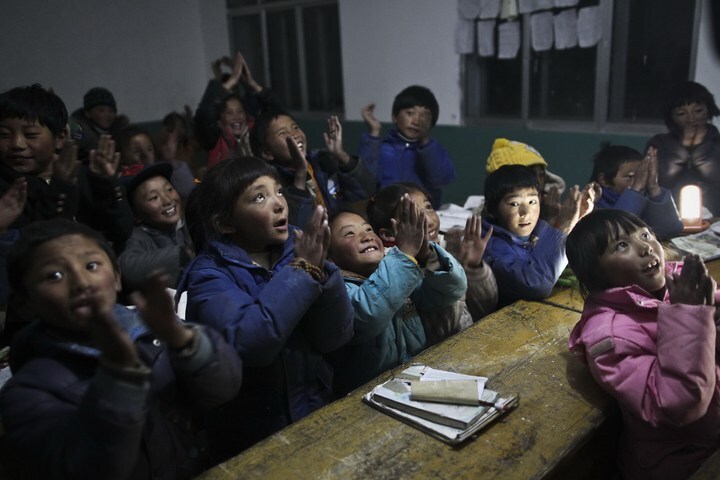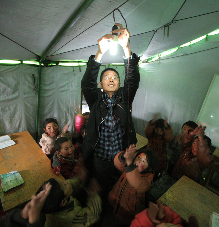 冬季的高原上,氧气浓度很低,在经历了艰苦的安装过程后,玉树高原村小的第一盏电灯被点亮了。