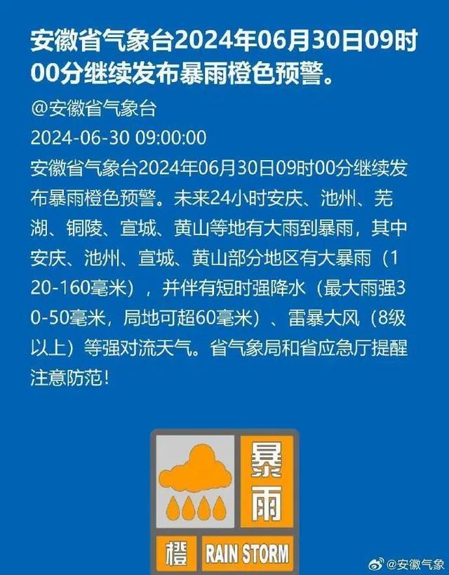安徽省气象台2024年06月30日09时00分继续发布暴雨橙色预警。未来24小时安庆、池州、芜湖、铜陵、宣城、黄山等地有大雨到暴雨,其中安庆、池州、宣城、黄山部分地区有大暴雨(120毫米-160毫米),并伴有短时强降水(最大雨强30毫米-50毫米,局地可超60毫米)、雷暴大风(8级以上)等强对流天气。
