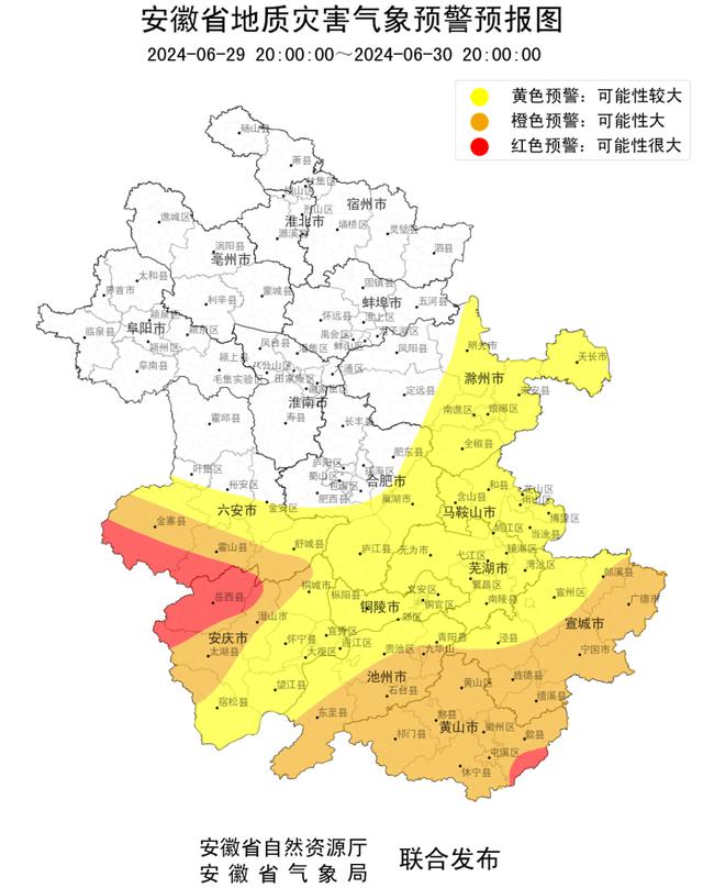 6月29日16时,安徽省气象局和安徽省自然资源厅联合发布地质灾害气象预警预报,2024年6月29日20时—6月30日20时: