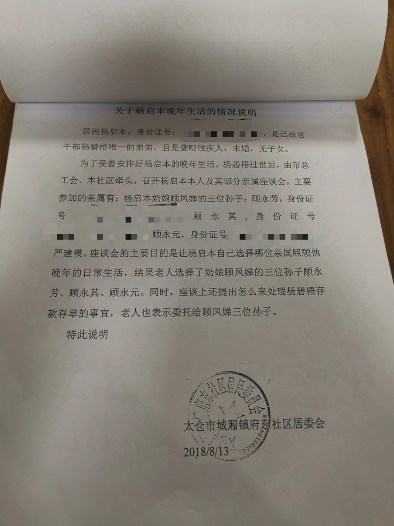 2014年6月,杨碧梧离世。府东社区居委会一份《关于杨启本晚年生活的情况说明》的材料显示,当时总工会和社区牵头,与顾家三兄弟及杨启本一起开了座谈会,让杨启本自己选择哪位亲属照顾他晚年的日常生活。