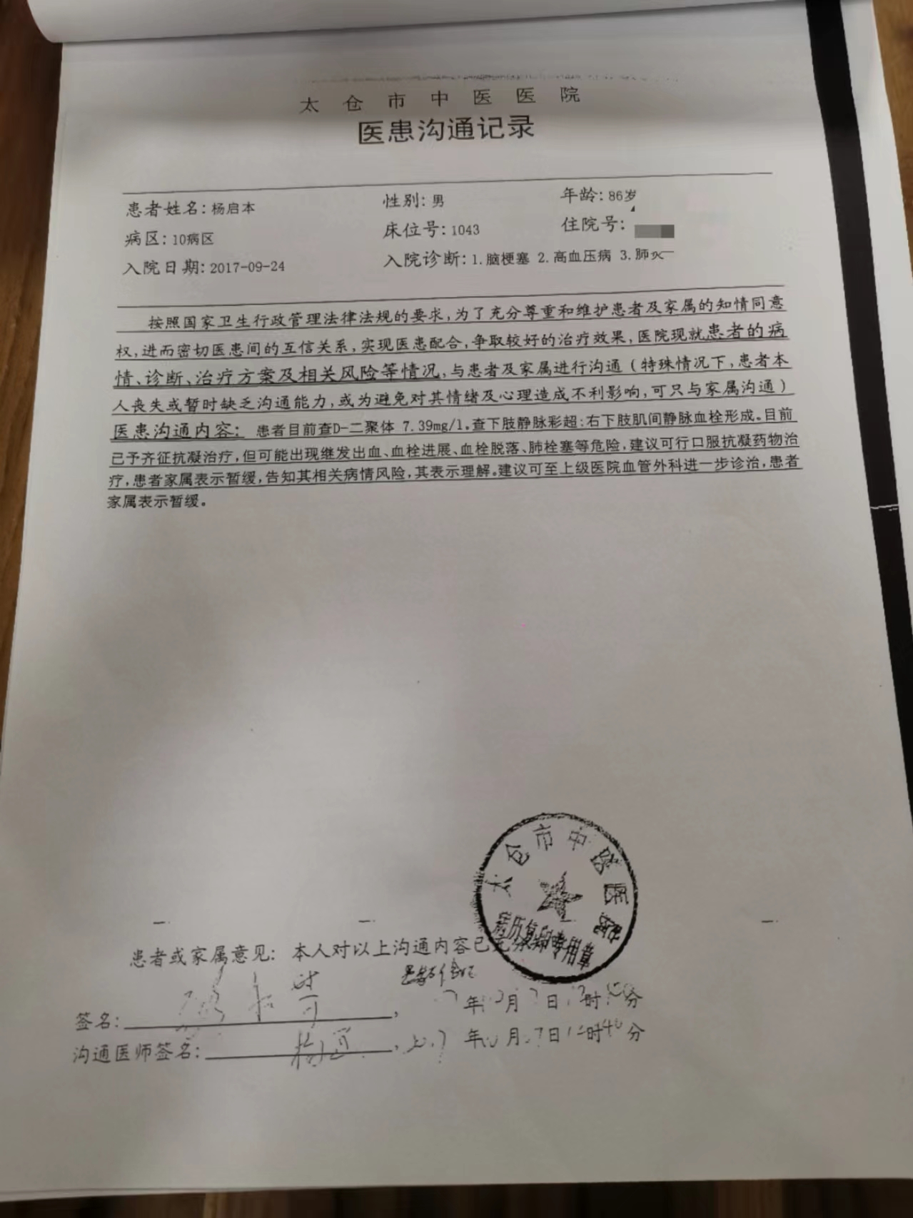 杨启本的鼻息有气,但身上凉了,顾永芳马上打了急救电话,附近的中医院救护车把老人送去就诊。杨启本被诊断为脑梗、半身瘫痪,当时87岁。