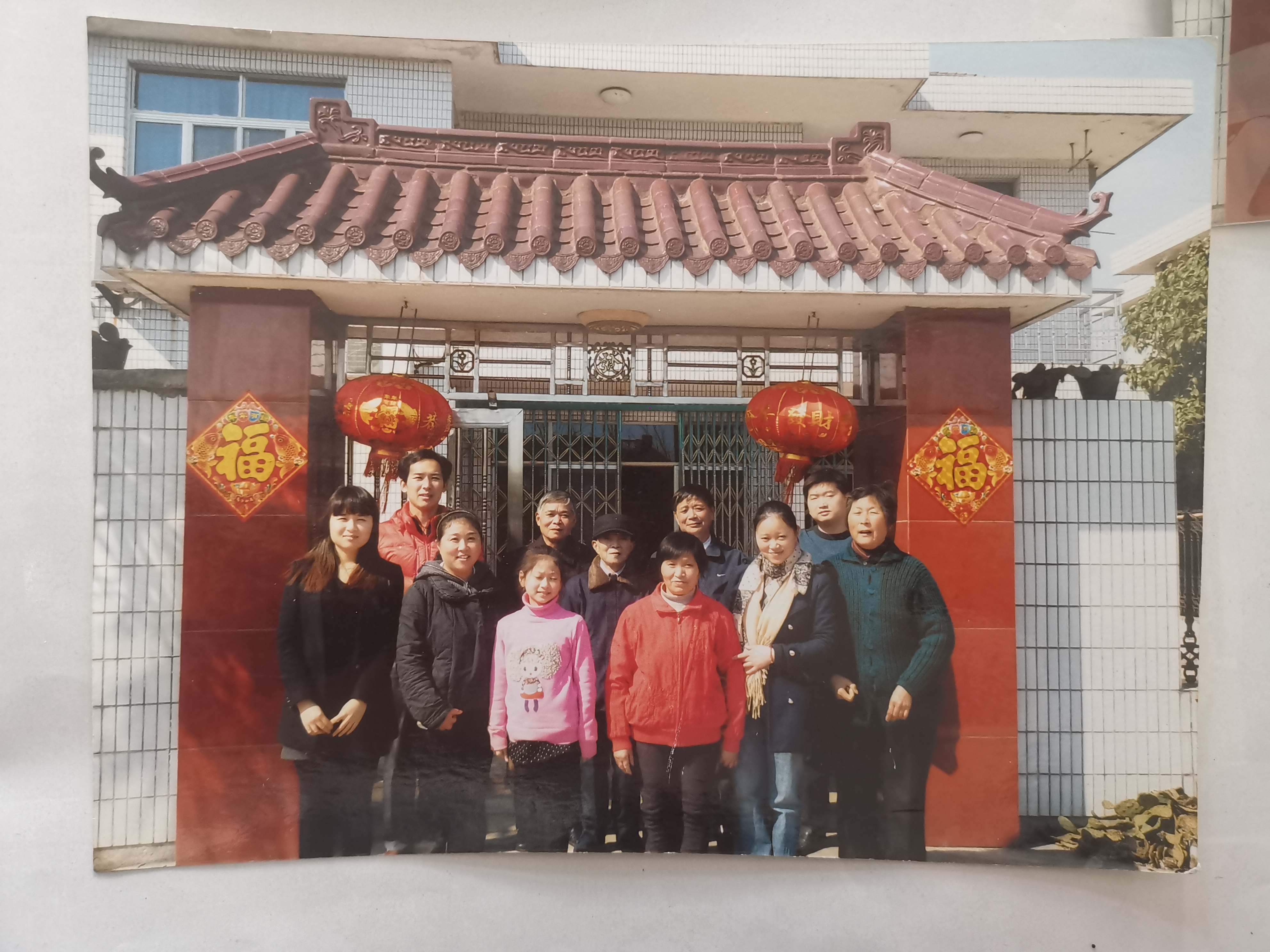 照片中间的老人一米五八的个子,戴着帽子,和蔼地看向镜头。在他身边围了两排小辈。大门上贴着的大红福字、一对灯笼,映着人们的满脸喜气。
