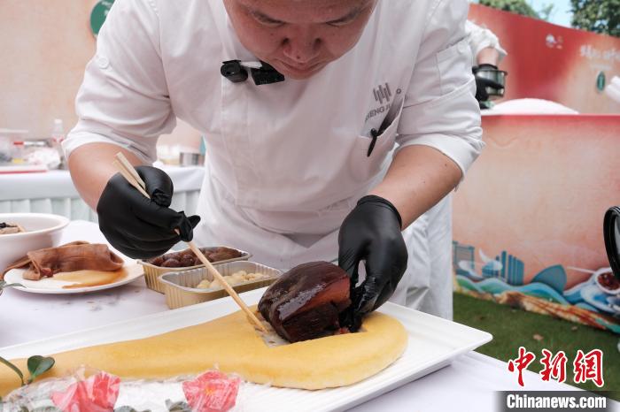 “金华火腿腌制技艺是国家级非物质文化遗产。我们取火腿的中间部位,经过蜂蜜、金华府酒等食材蒸制3个小时,制成‘蜜汁火方’。再加以金华兰溪金丝蜜枣、金华武义宣莲,搭配制成此次参赛作品,味道咸鲜回甜。”金华“蜜汁火方”的制作人郑剑波介绍,该制作技艺已经传承了20多年。