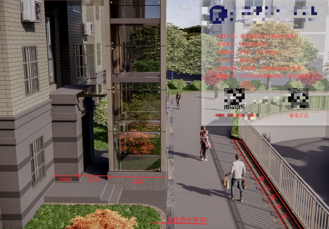2023年12月6日,惠泉社区在惠泉花园小区公告栏和43号楼单元门口都张贴了增设电梯的公示材料,包括业主意见征集单、加装电梯立面图等。因单元楼门口和小区内道路距离较近,为避免加装电梯占用小区道路,当时电梯加装方案是将单元楼门头拆解改装,留出空间给电梯。