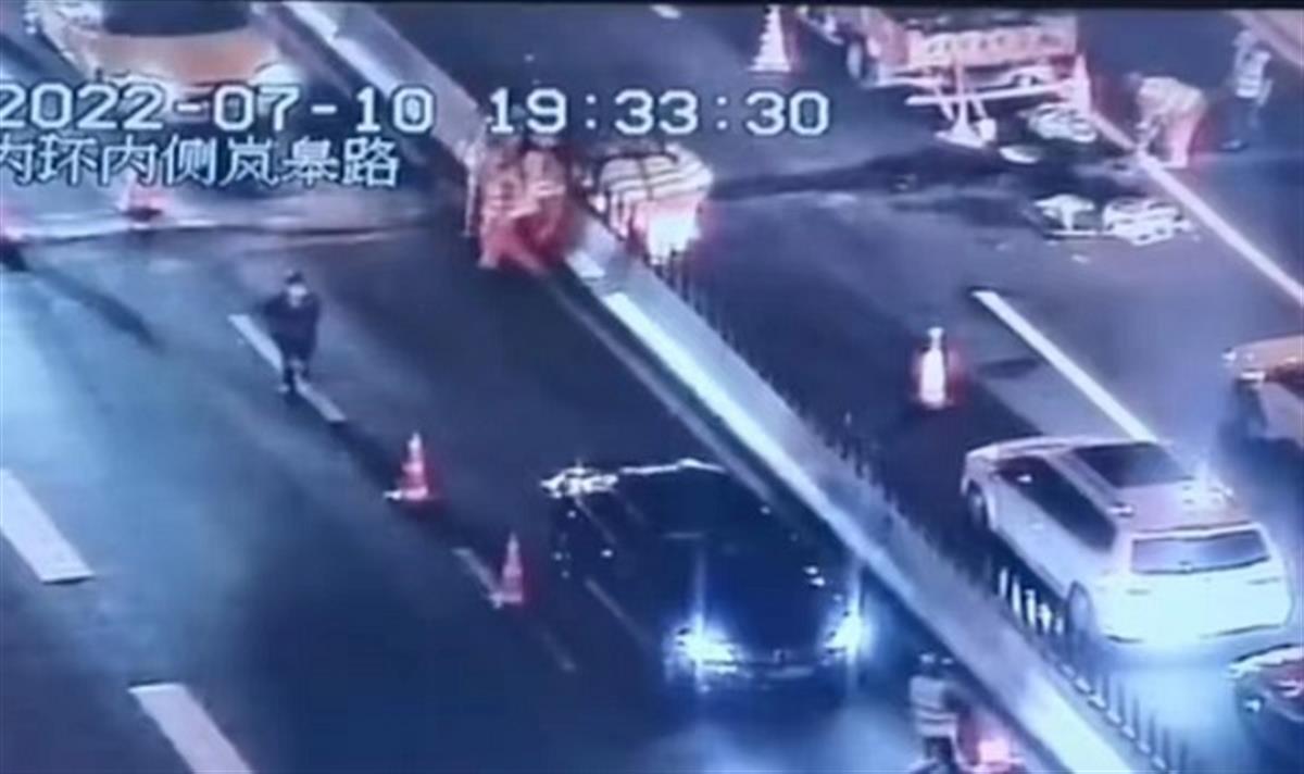 8日凌晨,工作人员对内环高架路近四平路出口方向翘起的路面进行抢修 (图源:受访者)