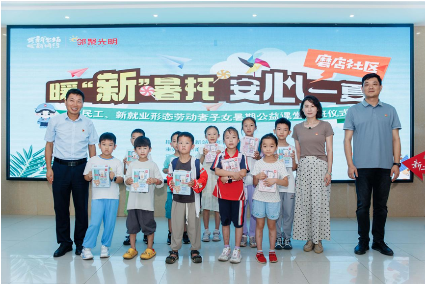 开班仪式,快乐起航。为丰富暑期农民工、新就业形态劳动者子女的学习与生活,减轻新就业形态劳动者家庭的后顾之忧,7月8日,由新站高新区总工会指导,磨店社区总工会主办,光明社居联合工会承办的“暖‘新’暑托,安心一夏”农民工、新就业形态劳动者子女暑期公益课堂正式开课。新站区总工会副主席梁华友参加开班仪式并讲话,他首先对暑托班的筹备工作给予肯定,并表示希望全体工作人员能够不负重托,尽心做好各项保障,做好孩子的知识拓展、兴趣培养、能力锻炼、习惯养成和安全保障,让暑托班“托”出开心,“托”出质量,“托”起放心。开班仪式结束后,梁主席与社区分管负责人为孩子们赠送开班礼包。