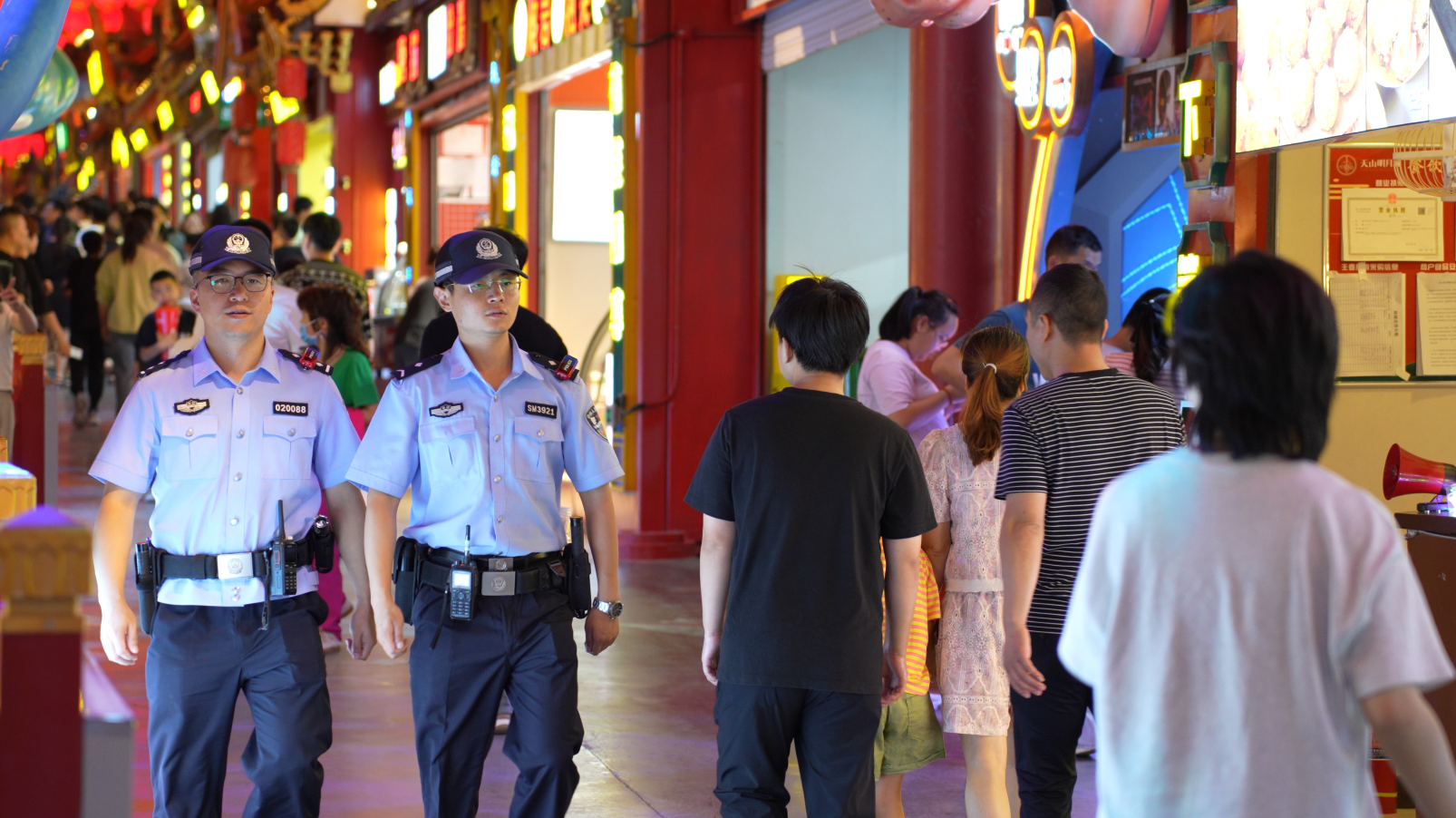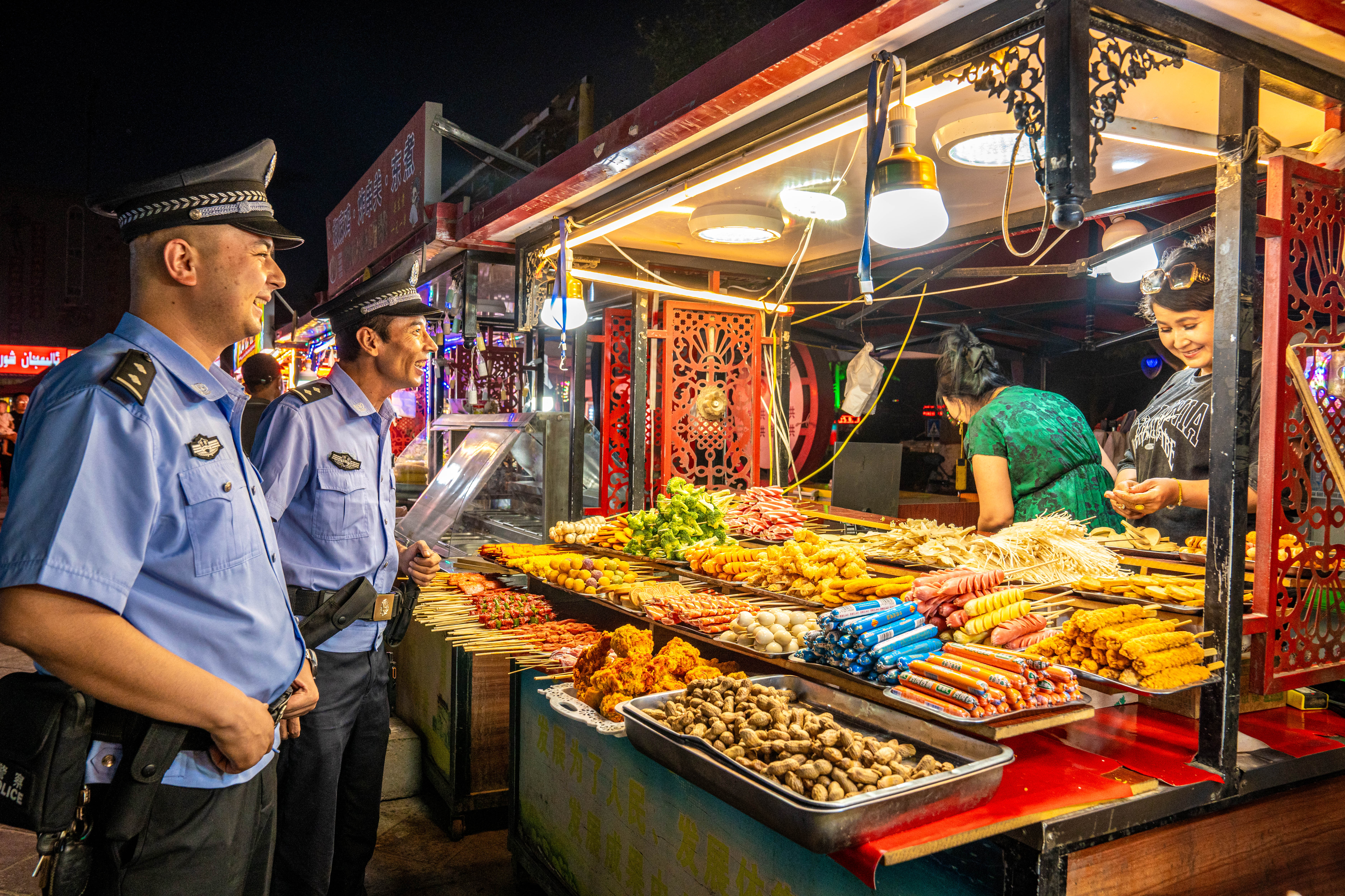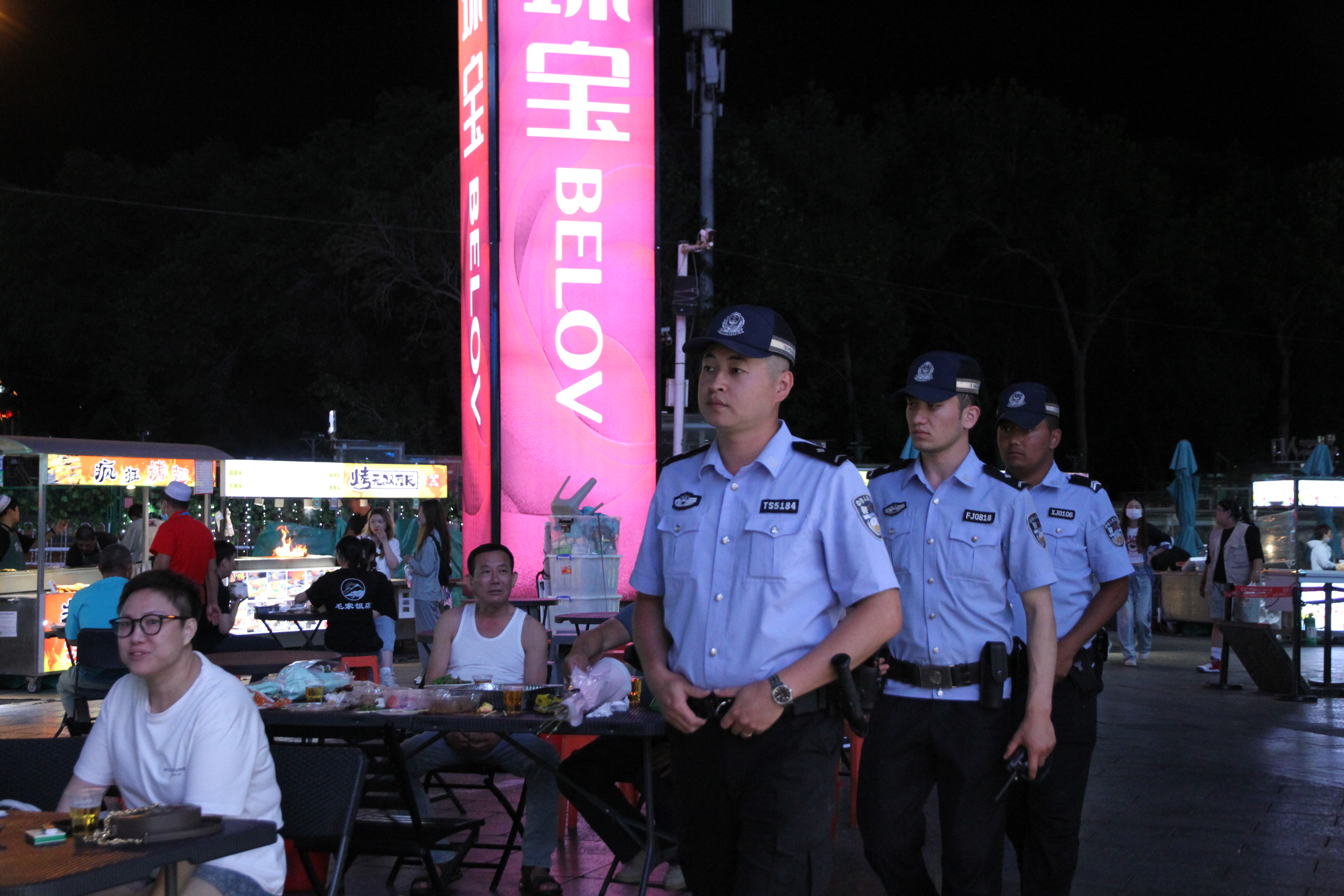 7月6日乌鲁木齐市公安局天山区分局民警在辖区夜市步巡。通讯员朱戈摄