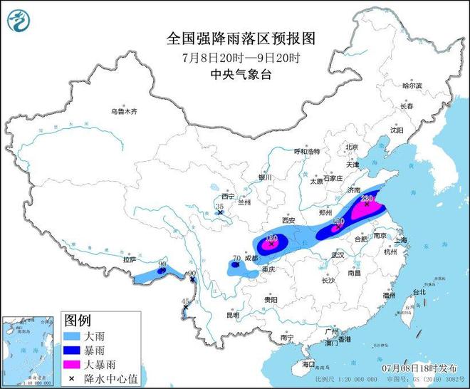 ▲全国强降雨落区预报图(7月8日20时-9日20时)
