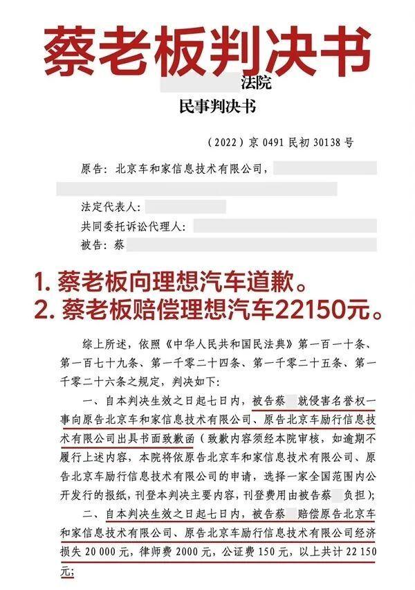 除了特斯拉之外,今年1月,蔡甲还被判向理想汽车登报道歉,并须赔偿22150元。