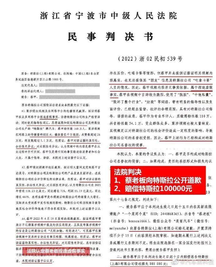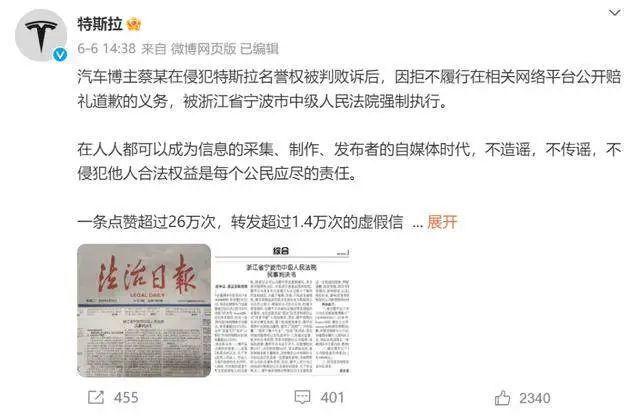 2023年6月6日,特斯拉在官方微博发文称,蔡某在侵犯特斯拉名誉权被判败诉后,因拒不履行在相关网络平台公开赔礼道歉的义务,被浙江省宁波市中级人民法院强制执行。