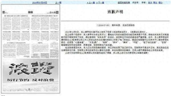 7月9日,根据《法治日报》电子版官网显示,网红“蔡老板”蔡甲登报向特斯拉发布致歉声明: