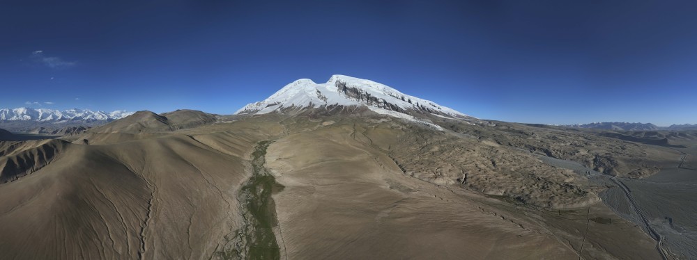 在新疆阿克陶县布伦口乡苏巴什村拍摄的慕士塔格峰及周边山脉景观(7月3日摄,无人机全景照片)。新华社记者 胡虎虎 摄