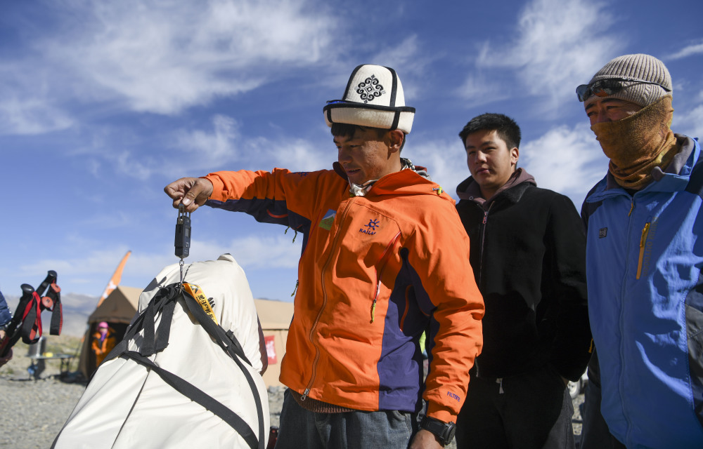 7月4日,在新疆慕士塔格峰一处登山营地,塔西巴伊(左)将登山者的物品称重。新华社记者 胡虎虎 摄