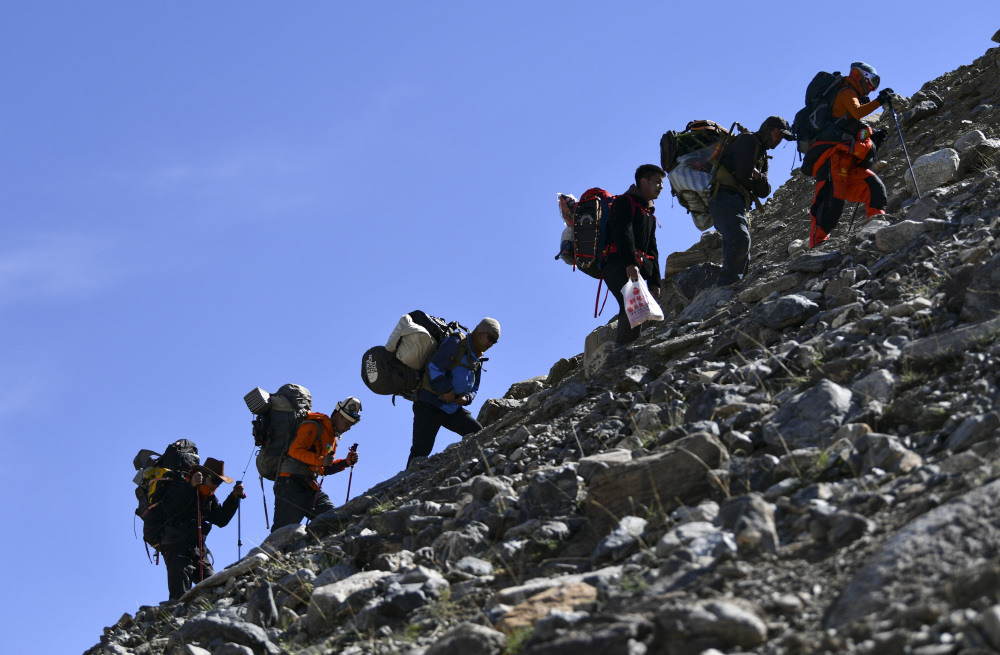 7月4日,塔西巴伊(左二)背着约25公斤的物品和同伴一起行进在慕士塔格峰的山坡上。新华社记者 胡虎虎 摄