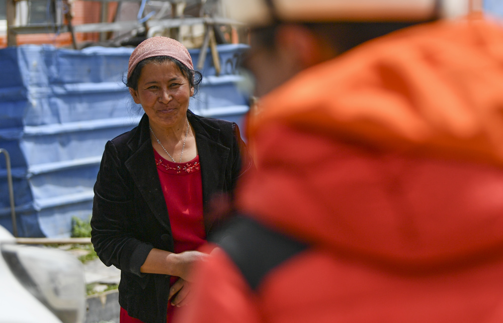 7月5日,塔西巴伊·加尼拜克下山后回到家,母亲在门口等候,喜笑颜开。新华社记者 胡虎虎 摄