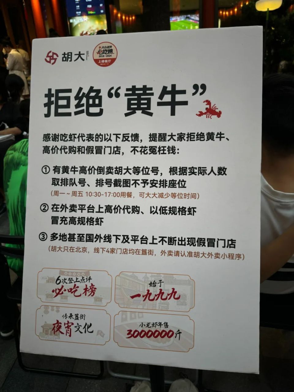 虽说该用户一直强调自己属于正规团队、正规商铺,不过,此类黄牛代排的行为却存在一定风险。北京商报记者走访北京胡大饭馆门店时看到,其门店中立有“拒绝黄牛”的牌子,上面写着“有黄牛高价倒卖胡大等位号,根据实际人数取排队号、排号截图不予安排座位”,排号页面下方也有“胡大与你一起拒绝‘黄牛’不花冤枉钱”的字样。其门店工作人员也表示,线上排队取号程序需要在门店附近100米时才能取号,而有的黄牛号门店无法确认。