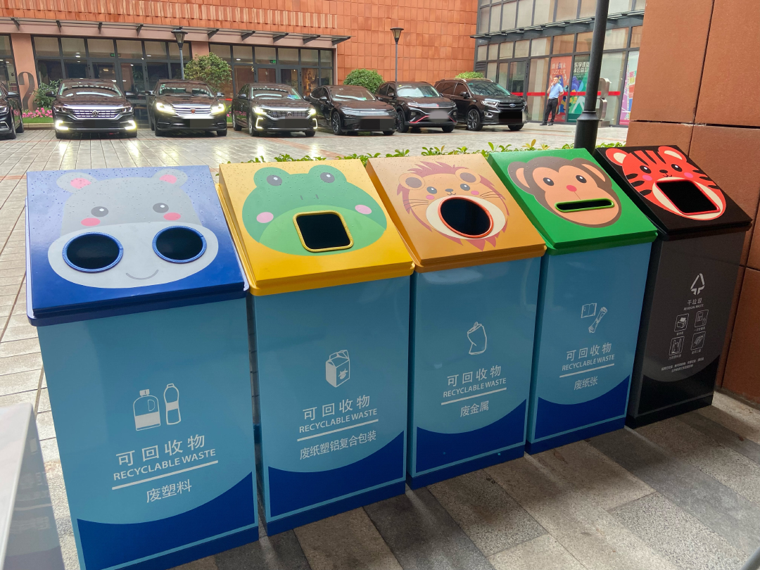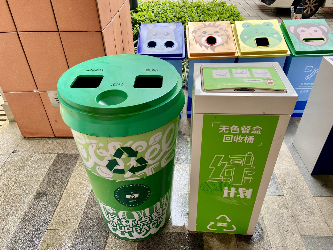 记者还在现场看到了多款造型的垃圾箱:印有卡通动物图案的垃圾箱、咖啡杯造型的饮品杯回收箱、无色餐盒回收桶、一组蓝色系可回收物垃圾箱等。