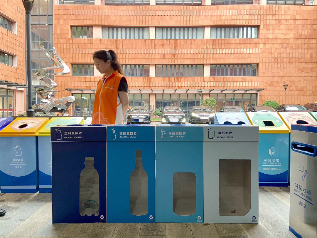 这组蓝色系可回收物垃圾箱已在静安区机关事业单位投用。