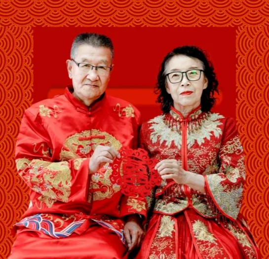 在内蒙古呼和浩特,王柱爷爷和他的爱人张鲜玲奶奶在一群大学生的辅助下换上中式礼服,弥补了过去几十年没能拍一组婚纱照的遗憾。