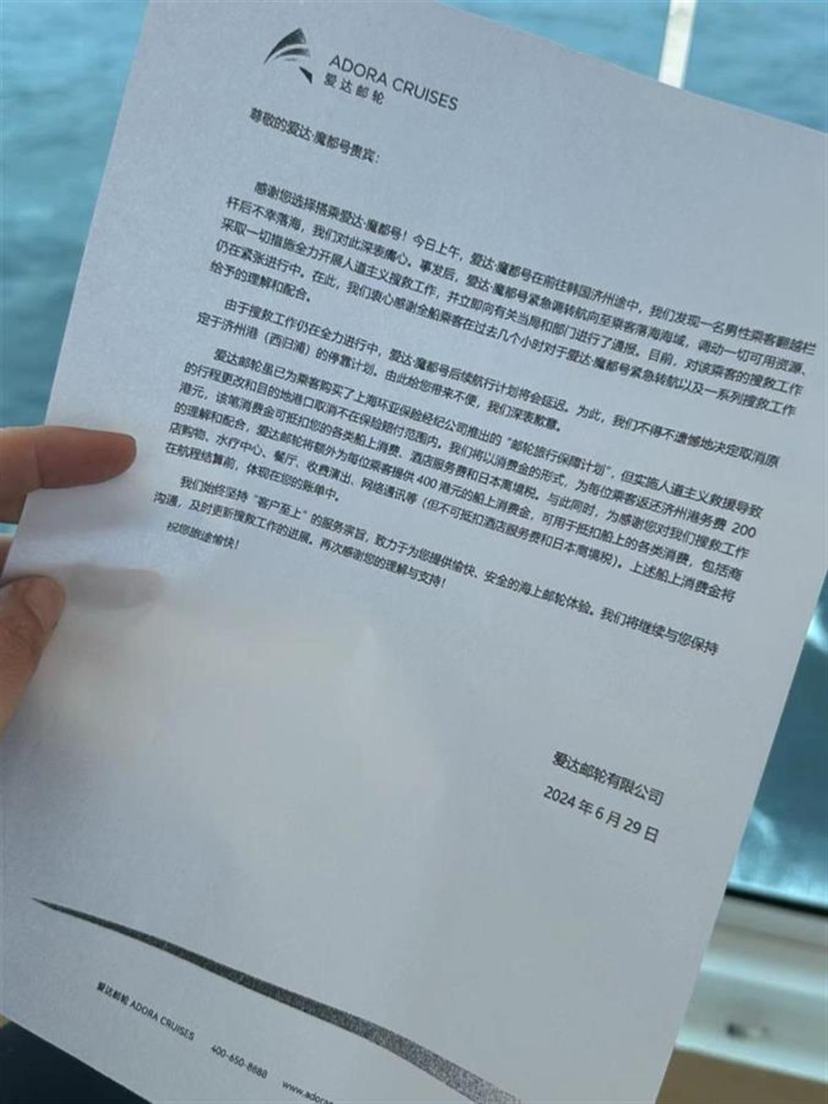 爱达邮轮方面6月29日对男乘客坠海一事的说明显示:“由于搜救工作仍在全力进行中,爱达·魔都号后续航行计划将会延迟。邮轮方面决定取消原定于济州港(西归浦)的停靠计划。将以消费金的形式,为每位乘客返还济州港务费200港元,可抵扣各类船上消费、酒店服务费和日本离境税。同时,为了感谢乘客对搜救工作的理解和配合,邮轮额外为每位乘客提供400港元的船上消费金,可用于抵扣船上的各类消费,包括商店购物、水疗中心、餐厅、收费演出、网络通讯等,但不可抵扣酒店服务费和日本离境税。”