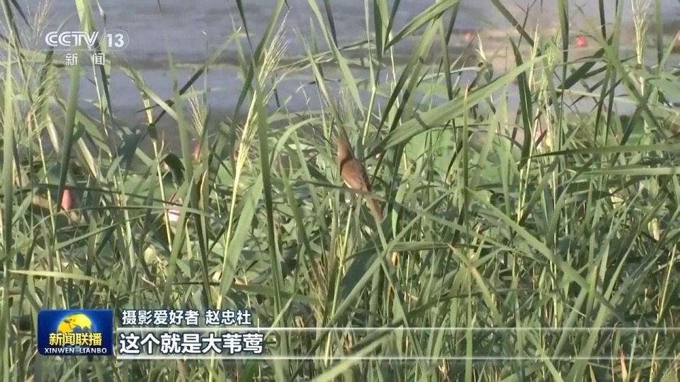 摄影爱好者 赵忠社:这个就是大苇莺,站在芦苇上面不停地唱歌,这个鸟以前很少见,几乎我没有拍到过,特别是像朱鹮、黑鹳这一类的,拍到好片子,高兴的不是一天,那有时候逢人就说。
