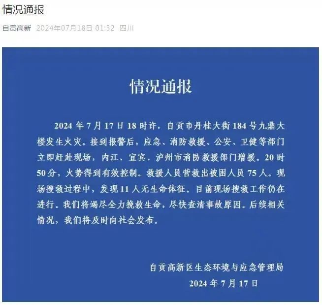 2024年7月17日18时许,自贡市丹桂大街184号九鼎大楼发生火灾。接到报警后,应急、消防救援、公安、卫健等部门立即赶赴现场,内江、宜宾、泸州市消防救援部门增援。20时50分,火势得到有效控制。救援人员营救出被困人员75人。现场搜救过程中,发现11人无生命体征。目前现场搜救工作仍在进行。