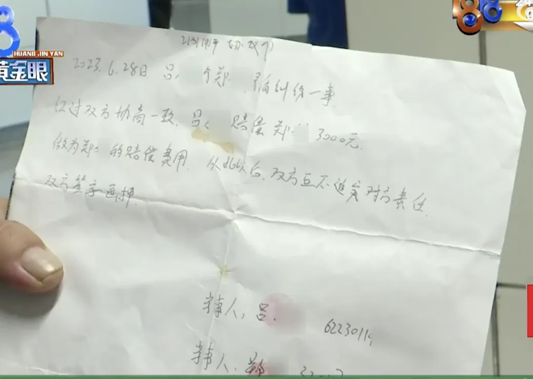 不仅如此,郑女士还提供了一张协议,大概内容是吕班长赔偿郑女士3000元,从此以后双方互不追究对方责任。上面有两个人的签名按了手印,并写了双方的身份证号码。